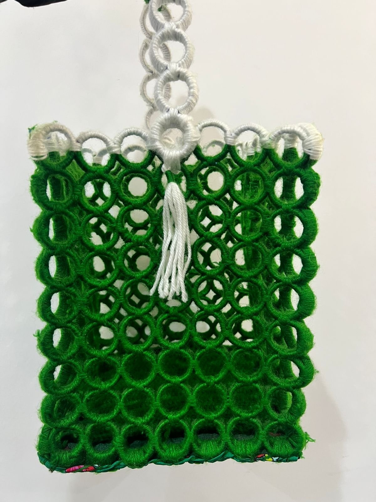 الحرفية Nورة عبدالله محمد تُبدع في صناعة الحقائب اليدوية باستخدام خيوط الصوف والحلقات البلاستيكية، وهي حرفة تجمع بين الإبداع وإعادة التدوير بأسلوب فني جميل.